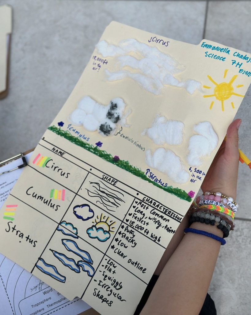 Warriors love cloud gazing ! Mrs. Sargent’s Grade 7 Honors Science class took to the rooftop to explore cloud formations. Students completed an assignment where they observed and sketched the various types of clouds they spotted.