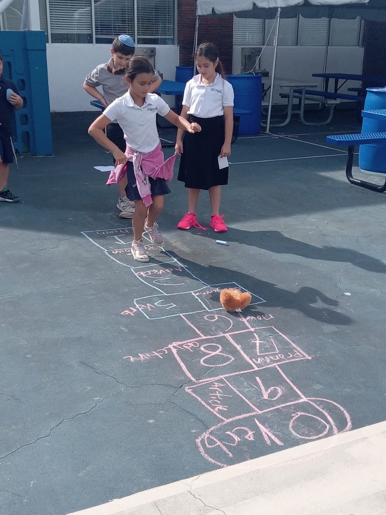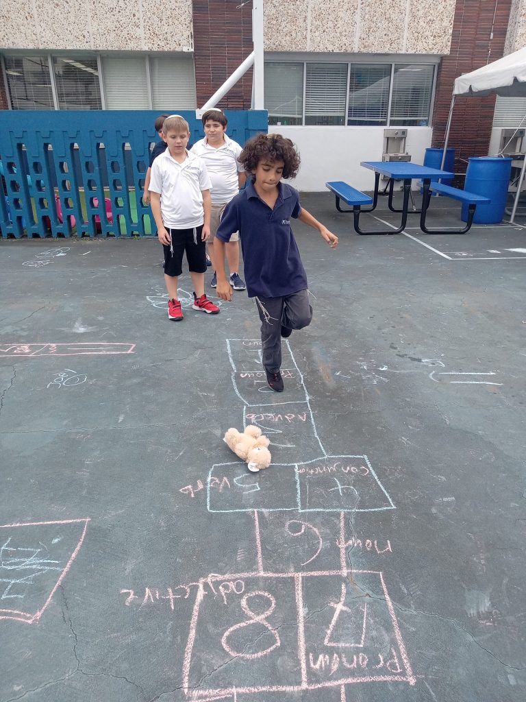 To further reinforce this skill, students played the Grammar Hopscotch game. Each group of students drew the familiar Hopscotch pattern of rectangles on the ground, and then they proceeded to play. The rules followed those of the traditional game, with the exception that each square represented a different part of speech. Students called out a noun, pronoun, adverb, verb, conjunction, adjective, or article, depending on where the bean ban bear they threw landed. They had time to think of a word, as they hopped to the rectangle. They also had to use that word in a sentence.